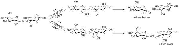 溶解性多糖單氧酶(LPMO)是一種在真菌和細菌中都存在的金屬酶。幾個晶體結構顯示該種酶包含一個銅原子和兩個組氨酸殘基,而一些真菌的LPMO也擁有纖維素結合區(qū)域。所有已知的LPMO都含有相對平坦的活性酶結合位點已讓酶與晶體纖維素結合,而此活性位點與水解纖維素酶的溝槽形活性區(qū)域相差很大。LPMO將多糖的C1或C4位羥化,而多糖則可以是纖維素、幾丁質、或更小的糖鏈。這種羥化作用需要氧氣,以及一個還原劑以將氧氣分子的第二個氧原子轉化為水。此還原劑可以是小分子(例如沒食子酸或者抗壞血酸鹽)或者是纖維二糖脫氫酶。在LPMO的羥化作用下,一個半縮酮產生并進一步導致多糖鏈的裂開;C1羥基化分裂位點產生了一個醛糖酸/內酯;C4羥基化產生了一個4-氧化糖(請見下圖)。